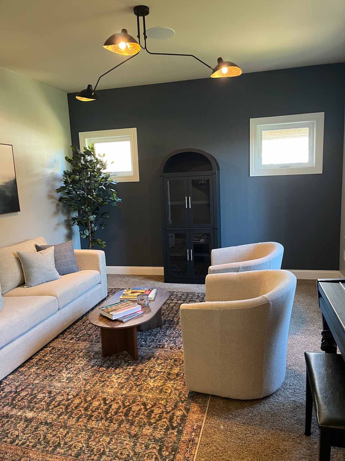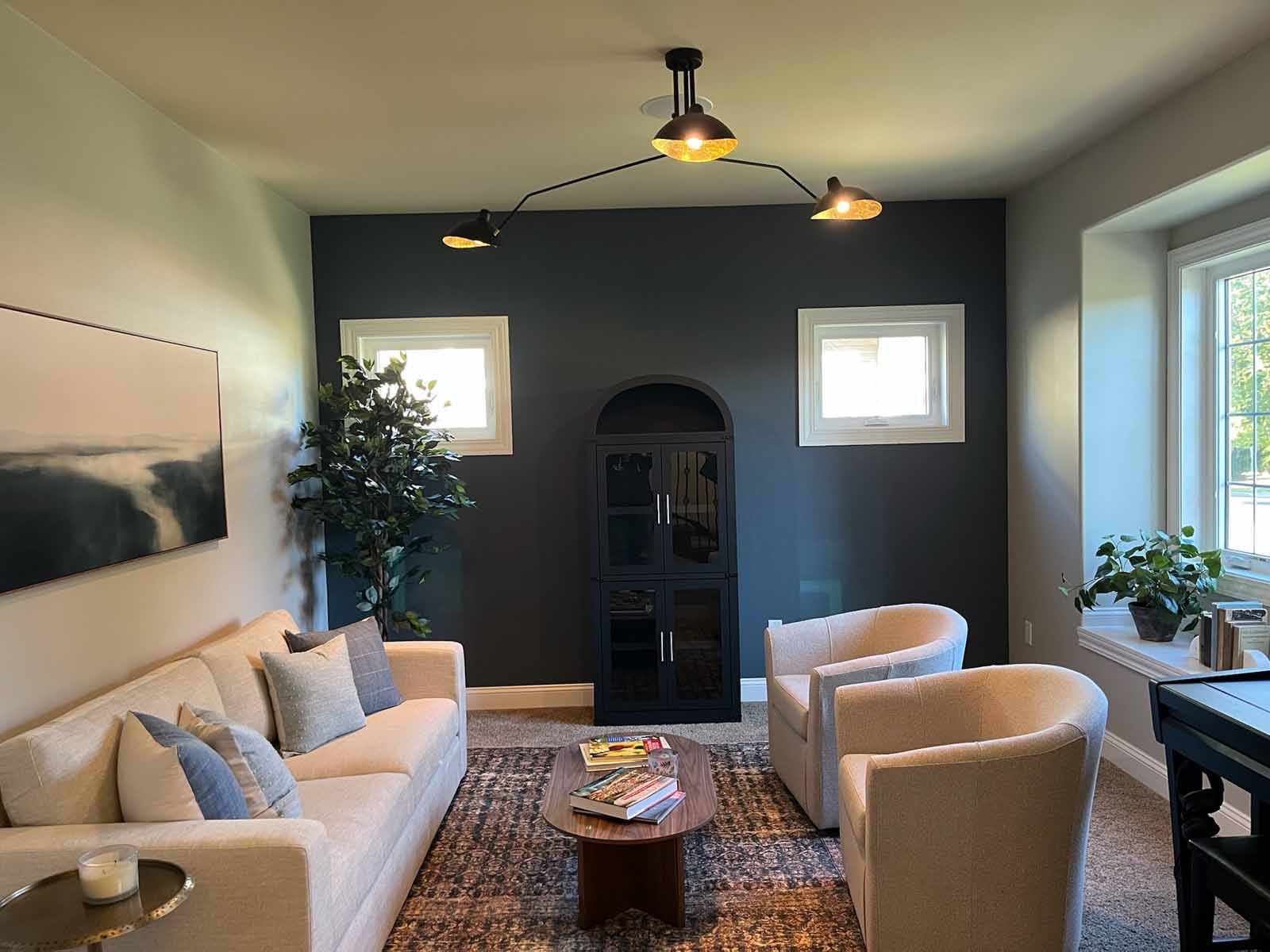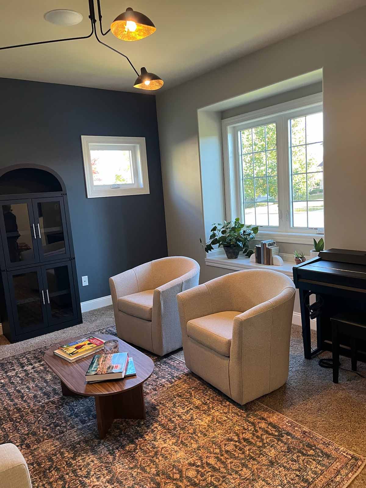 In this Verona home, we transformed the front sitting room into a polished, multipurpose space for empty nesters who love the color blue. A dramatic navy wallpaper anchors the back wall, creating a rich backdrop for cozy swivel chairs, a distressed rug, and layered accent lighting. The homeowners’ treasured piano remains a key feature, relocated near the window to make the room feel more open and functional for reading, relaxing, or working. An arched cabinet adds character and storage, while fresh furnishings and updated paint tie everything together with an elevated, collected feel.