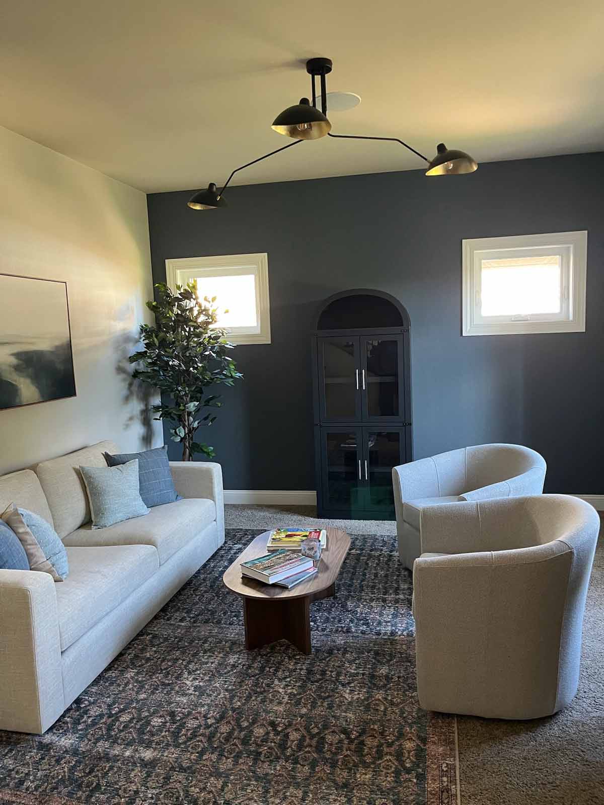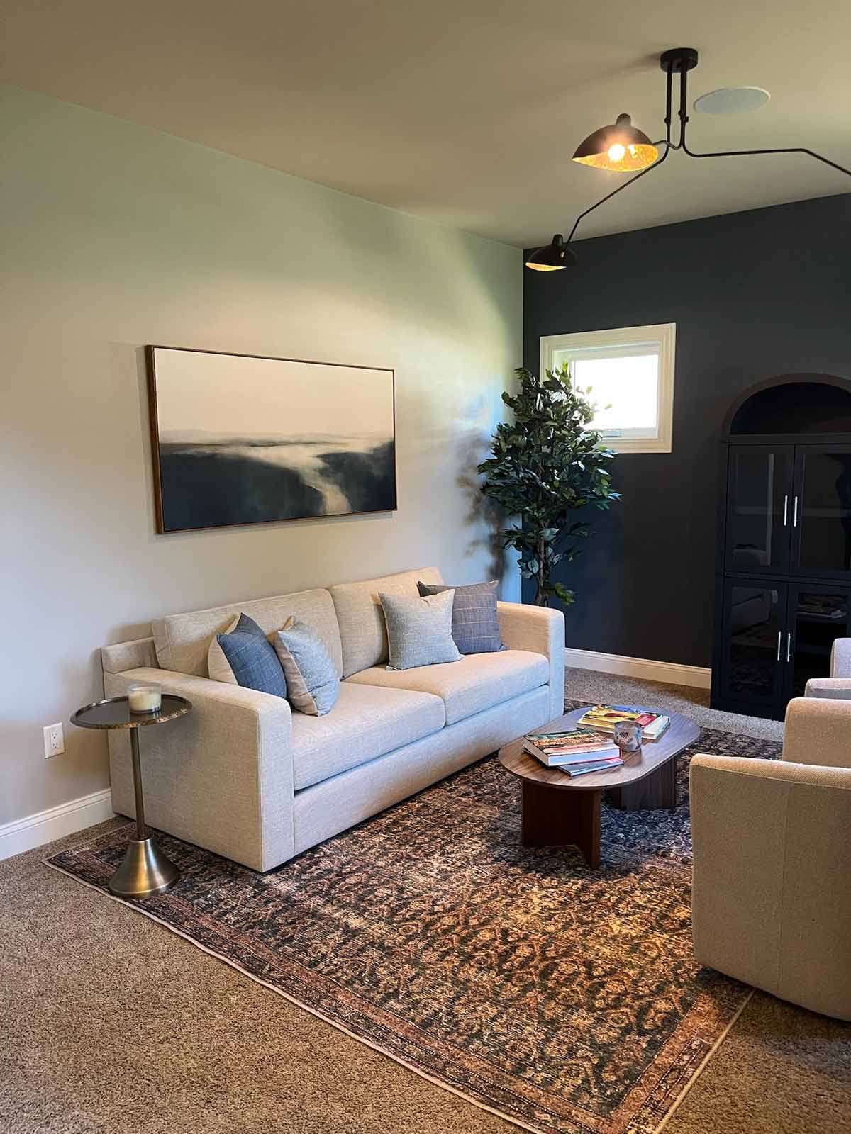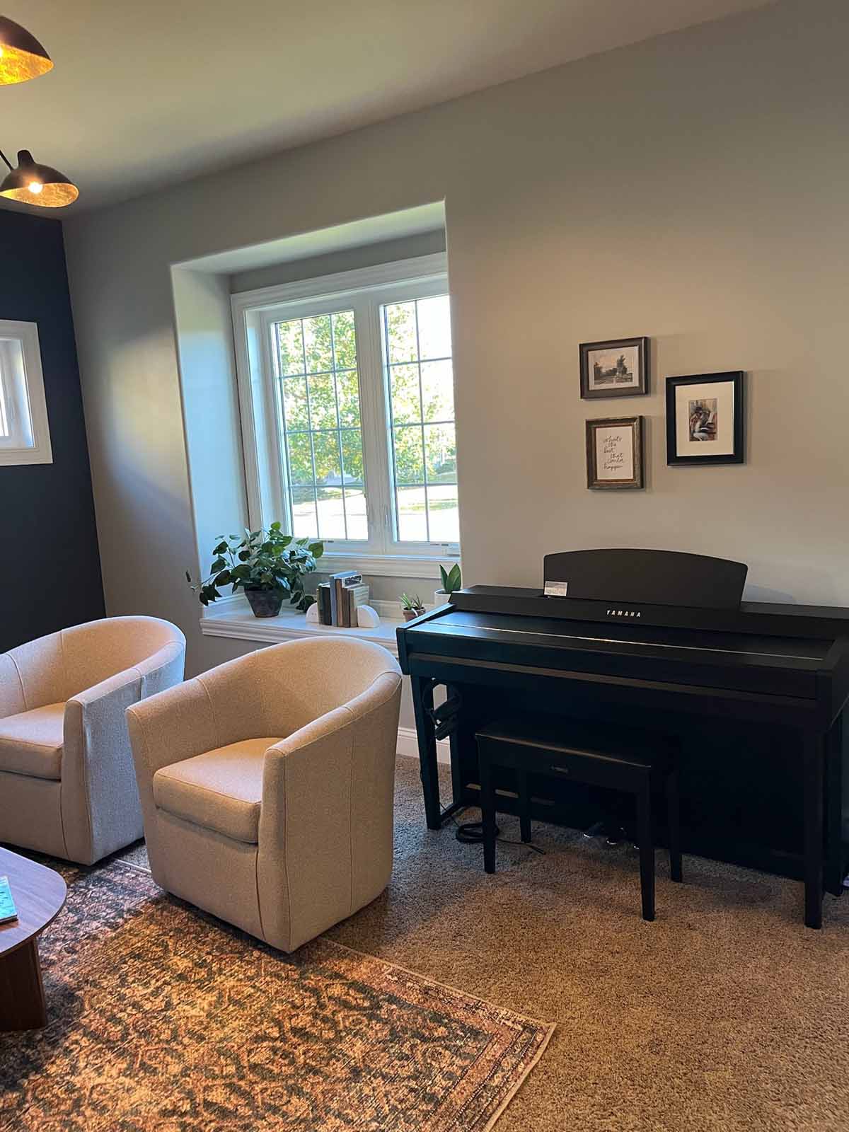 In this Verona home, we transformed the front sitting room into a polished, multipurpose space for empty nesters who love the color blue. A dramatic navy wallpaper anchors the back wall, creating a rich backdrop for cozy swivel chairs, a distressed rug, and layered accent lighting. The homeowners’ treasured piano remains a key feature, relocated near the window to make the room feel more open and functional for reading, relaxing, or working. An arched cabinet adds character and storage, while fresh furnishings and updated paint tie everything together with an elevated, collected feel.
